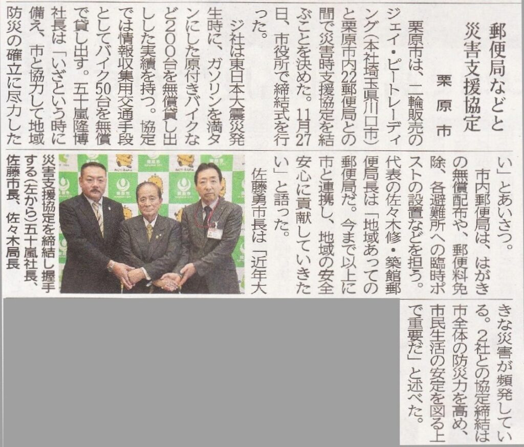 大規模な災害の発生時および災害が発生されると予測される場合に、栗原市へ交通手段として二輪車や燃料等を優先的に提供する協定を宮城県栗原市と締結する運びとなりました。