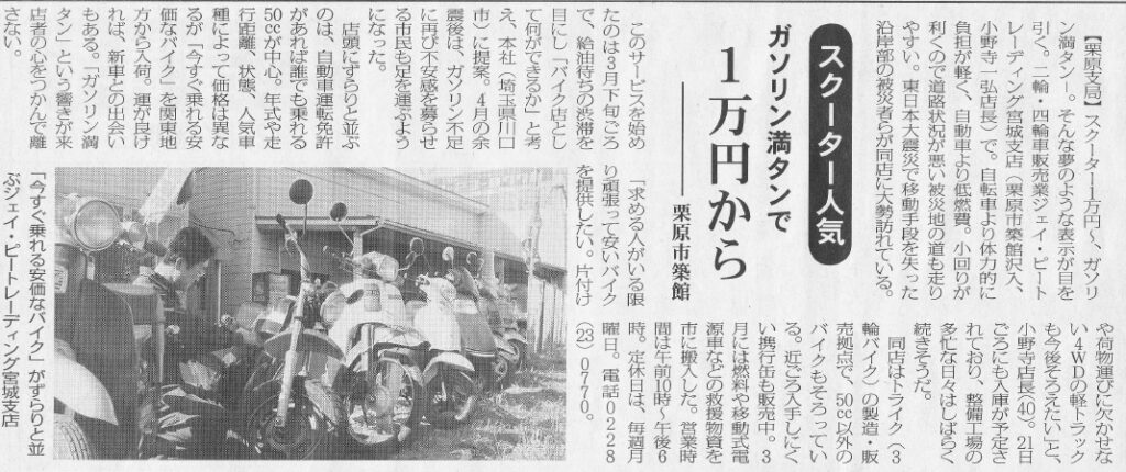 平成23年4月 ガソリン満タン1万円バイク販売開始(JAMPA設立前、ジェイ・ピートレーディングとしての活動です。)深刻なガソリン不足問題のためガソリン満タン1万円スクーターの販売を行いました。 自転車より長距離移動が可能で燃費もいいスクーター。津...